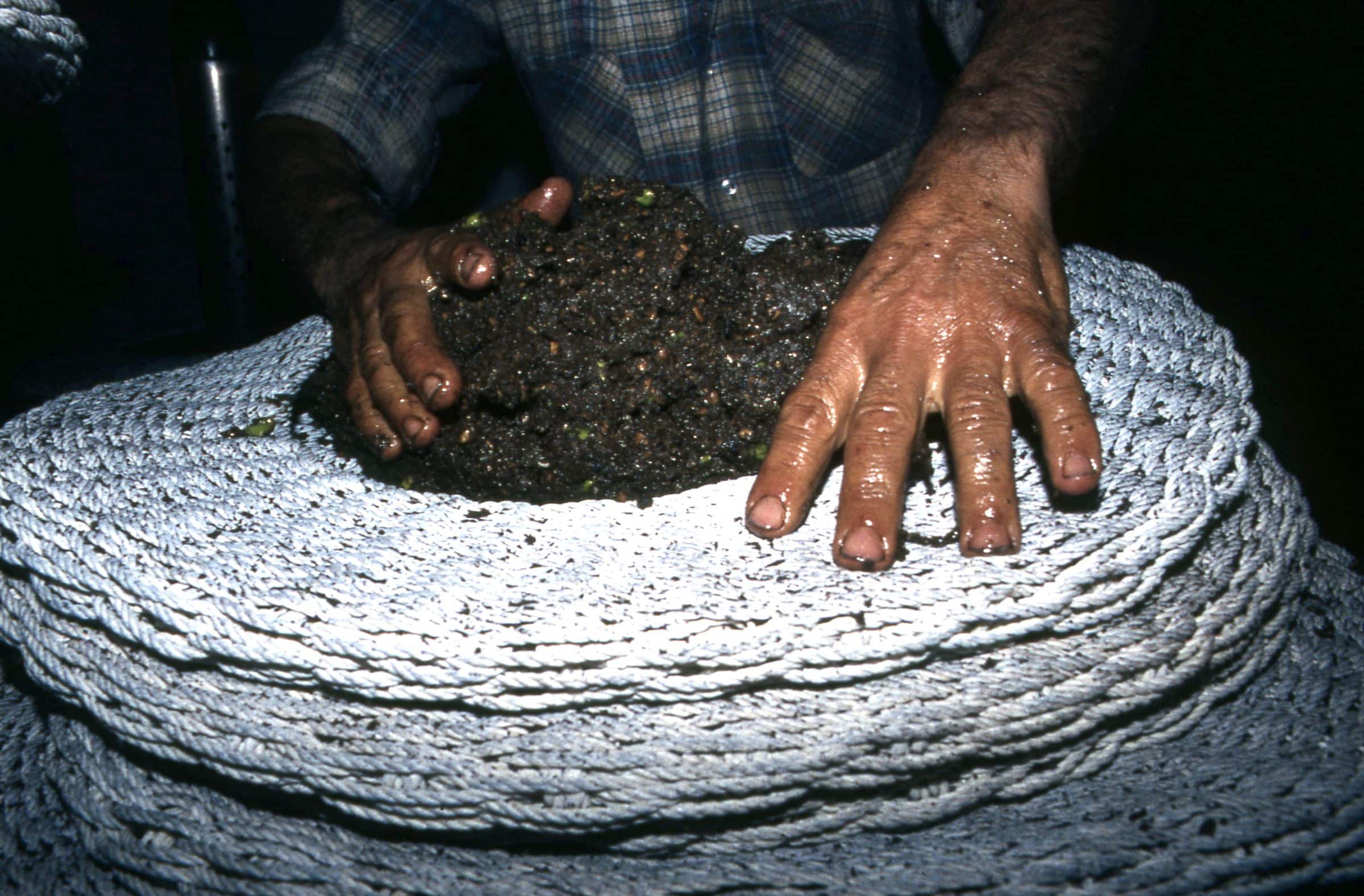 The next step is to introduce the olives to a circular stone trough with a large round millstone usually made of limestone. I was lucky enough to witness this, and all the subsequent steps in traditional olive oil production, during the late 1980’s, just outside Kannaviou Village in the upper Ezousas river valley. A man named Yiannos Dhimitriou, who at various stages of his life was butcher, tavern-owner, “Mukhtaris” (Mayor) and (most important!) regional representative for Carlsberg Beer, agreed to demonstrate the entire process along with some of his sons. Olives ready for processing were poured into the round olive mill and the large, heavy millstone was then turned repeatedly over the olives, crushing the skins and grinding up the olives into a rough, course state. Right away, an oily substance started to exude from the crushed skins, and semi-broken pits were visible sticking through the lacerations in the olive skins.