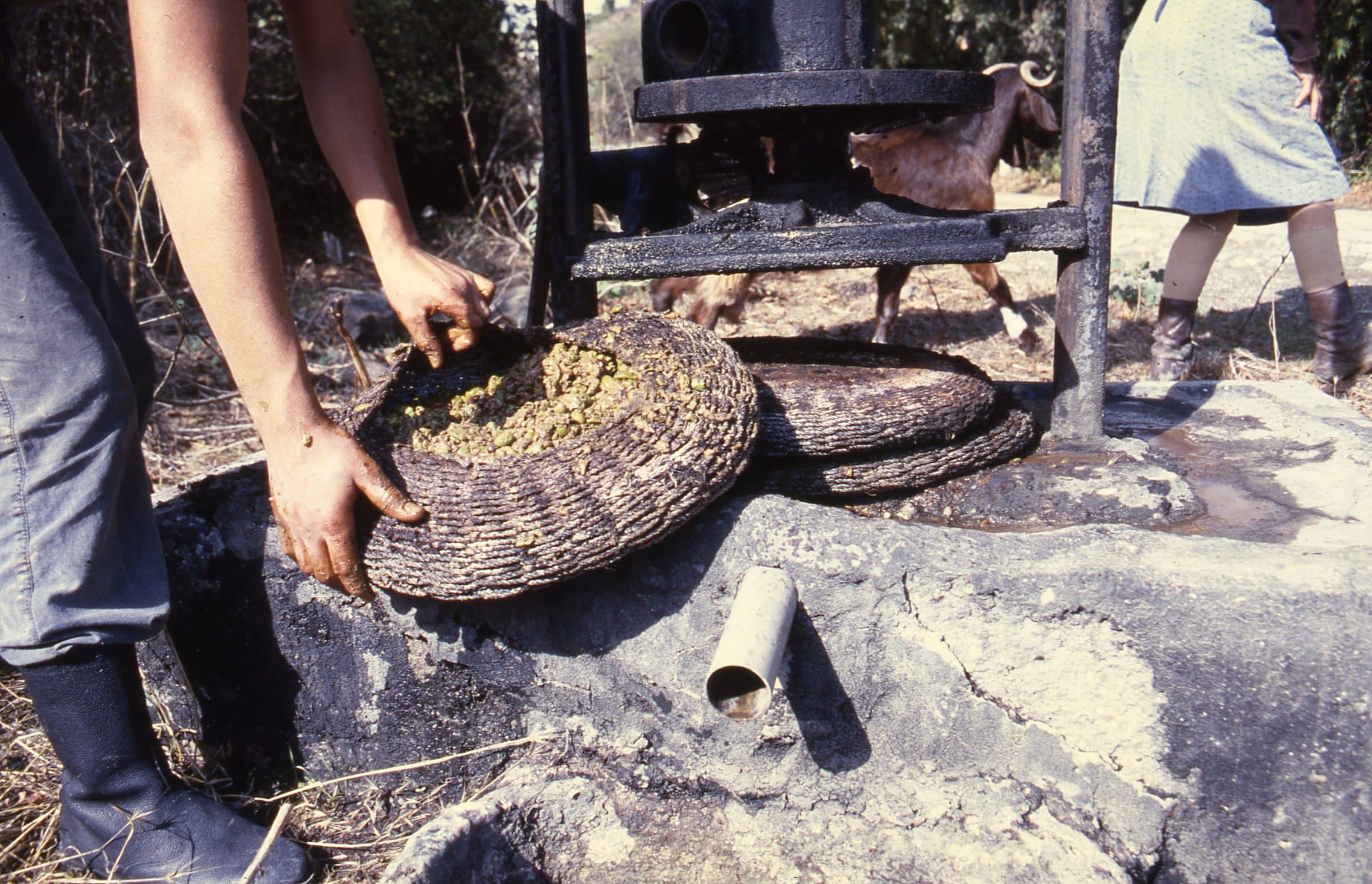 In the mid-late 1980, I had the rare opportunity to witness and photograph the production of Cypriot olive oil using “old school” processing techniques that had already largely dropped out of existence across the island. By the early to mid 1980s, most traditional olive oil production facilities had been up-dated or entirely replaced by modern olive oil presses. However, the age-old traditions of producing olive oil could still be found in remote villages, where people practiced the same simple system, using very similar tools and technology, to extract oil from their olives as they did way back to the Bronze Age at least, if not earlier.